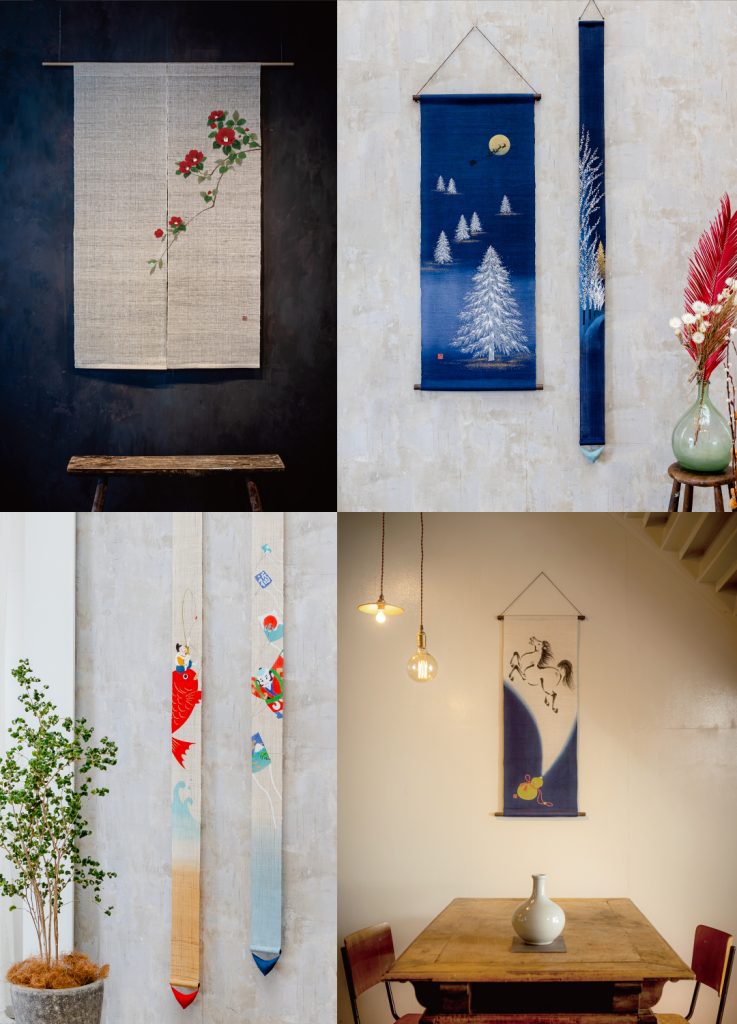手織りの麻を色彩豊かに染め上げた、京都洛柿庵ならではのタペストリーや麻小物、どうぞお楽しみください。